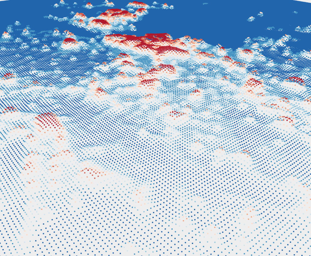 To render the map as particles instead of a continuous surface, specify renderMode:particles and optionally adjust the particleSize. It may be nice to fix the camera position if you use particle mode, because particles are always the same size regardless of how close/far the camera is from them. So when viewed from afar, we see a dense cloud, but when zoomed in, individual particles become hard to see as they are still small but now widely spaced.