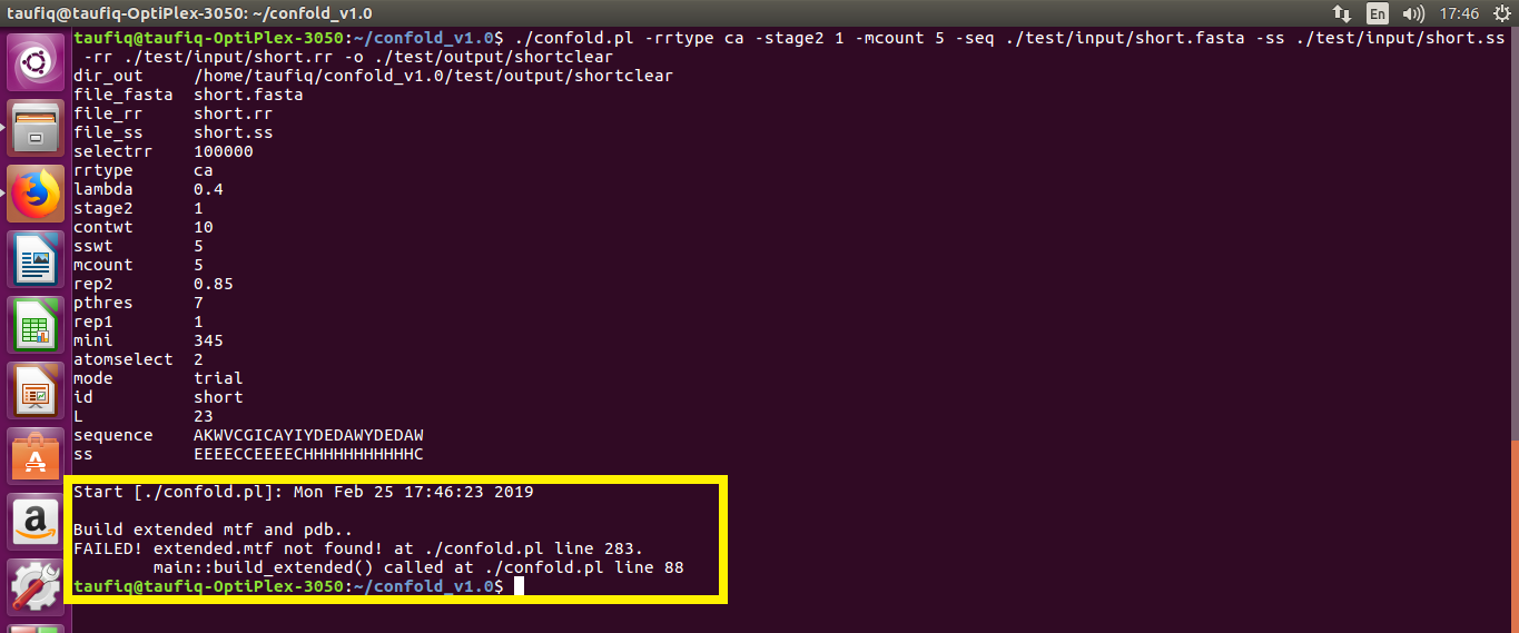 This is not an issue. It is just an error I am facing. The README part section 5.2 runs a script with parameters that takes input a sequence, contacts and secondary structure data and other related parameters to run the program. Everything up to this point runs without any errors. When this line is run in the terminal, 1.error.png (bold yellow box) happens. When I checked the output folder I saw in 2.extended.mtf.png(bold green box) that the extended.mtf file is created. (Although the timestamp in the two images are different, extended.mtf is created every time I run the shell script written at README Section 5.2).