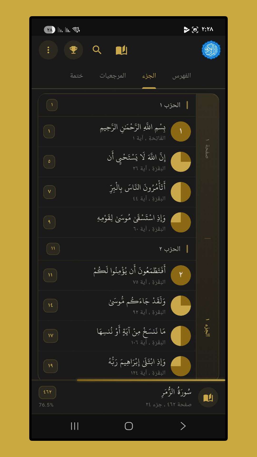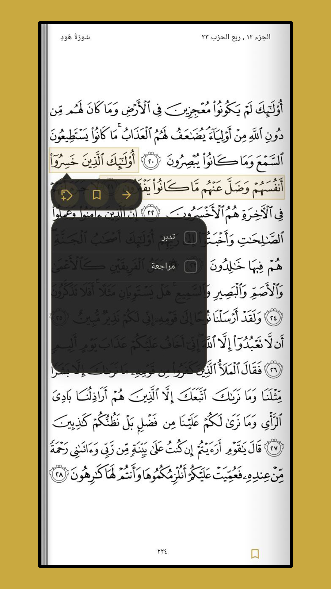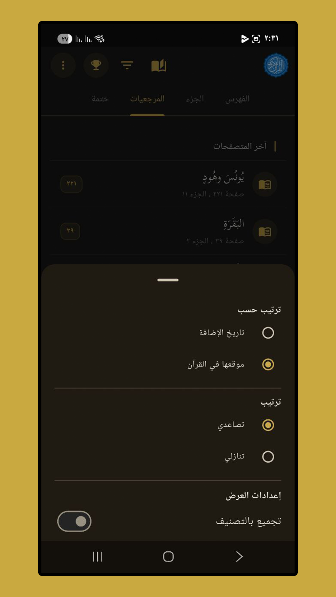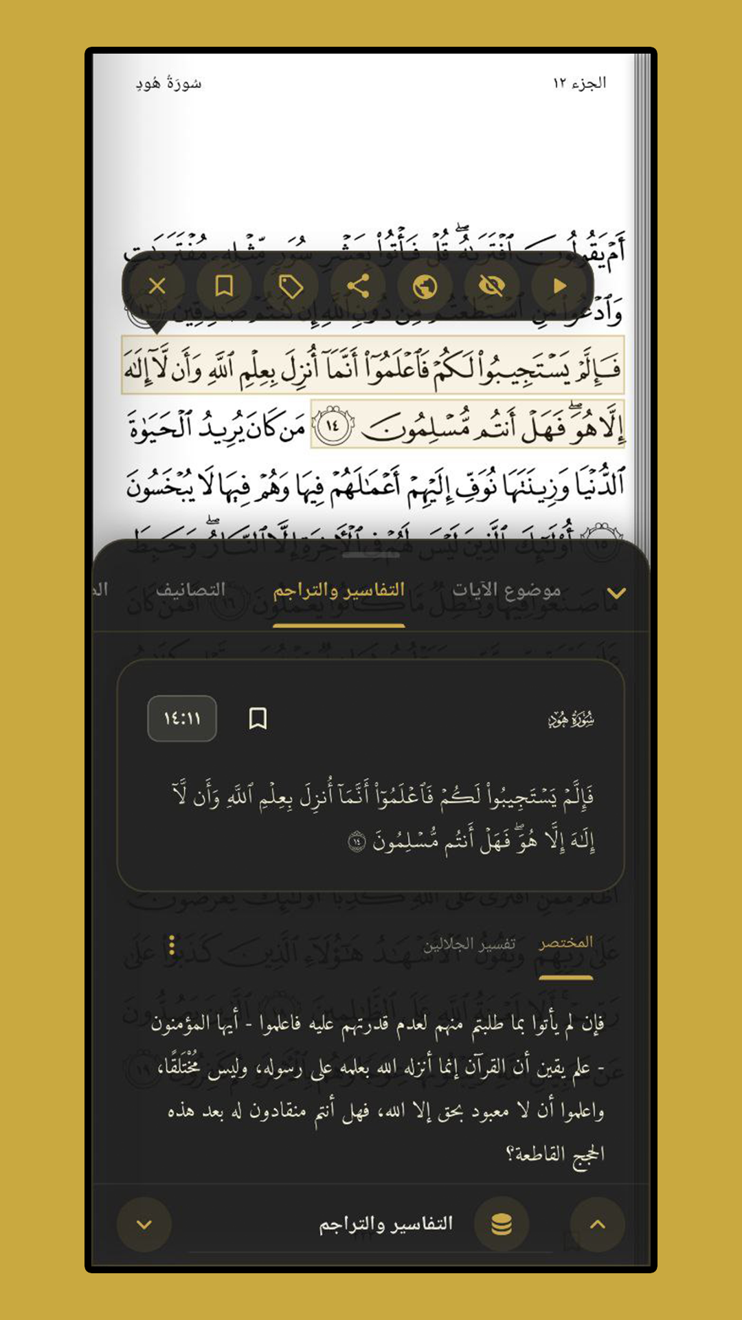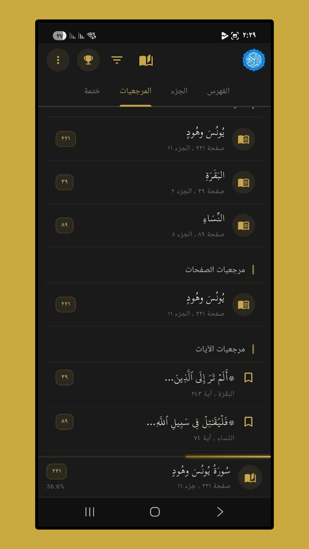 - المرجعيات الذكية: أضف علامات مرجعية للآيات أو الصفحات وقم بتنظيمها في مجلدات وتصنيفات خاصة بك.