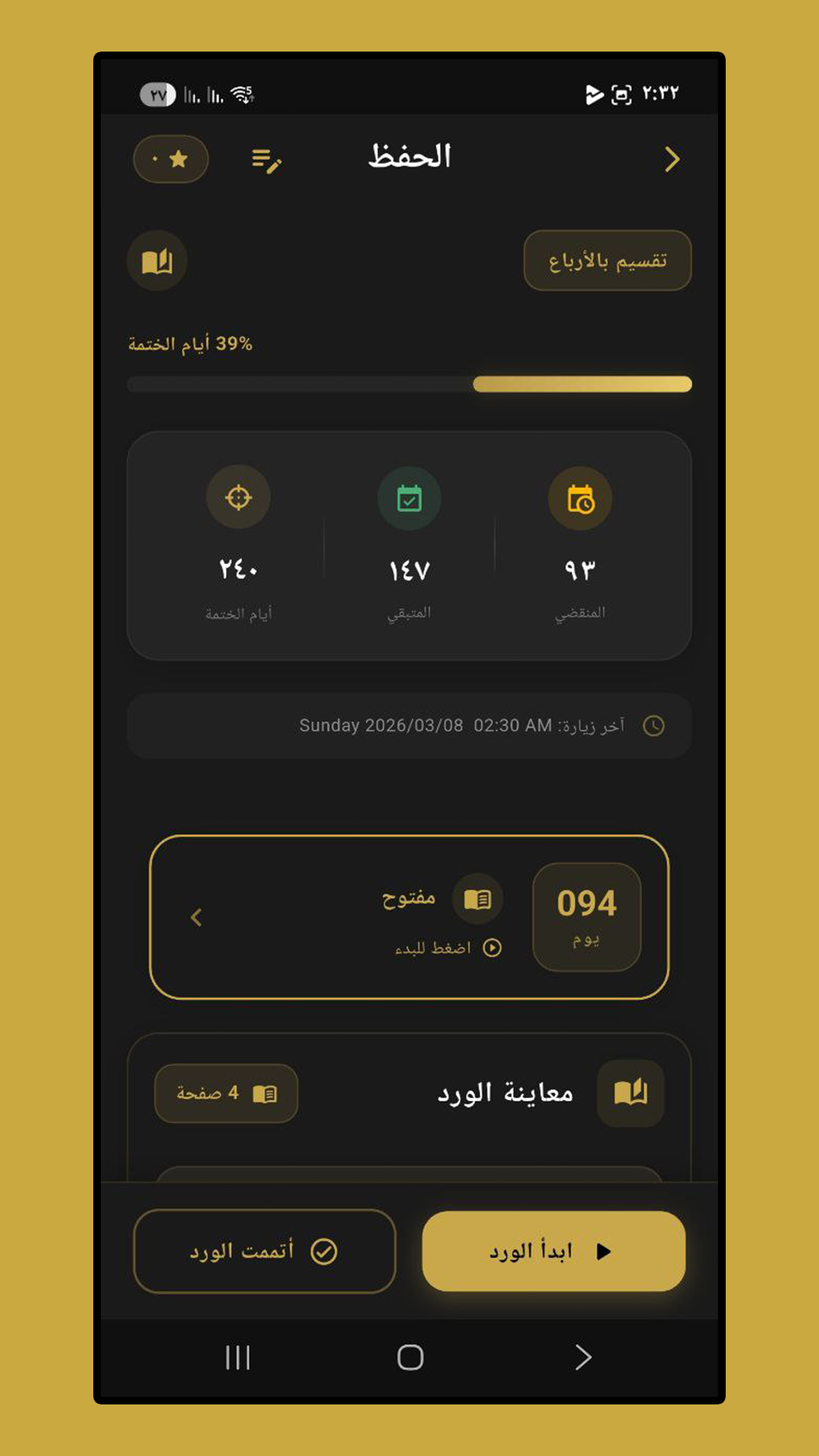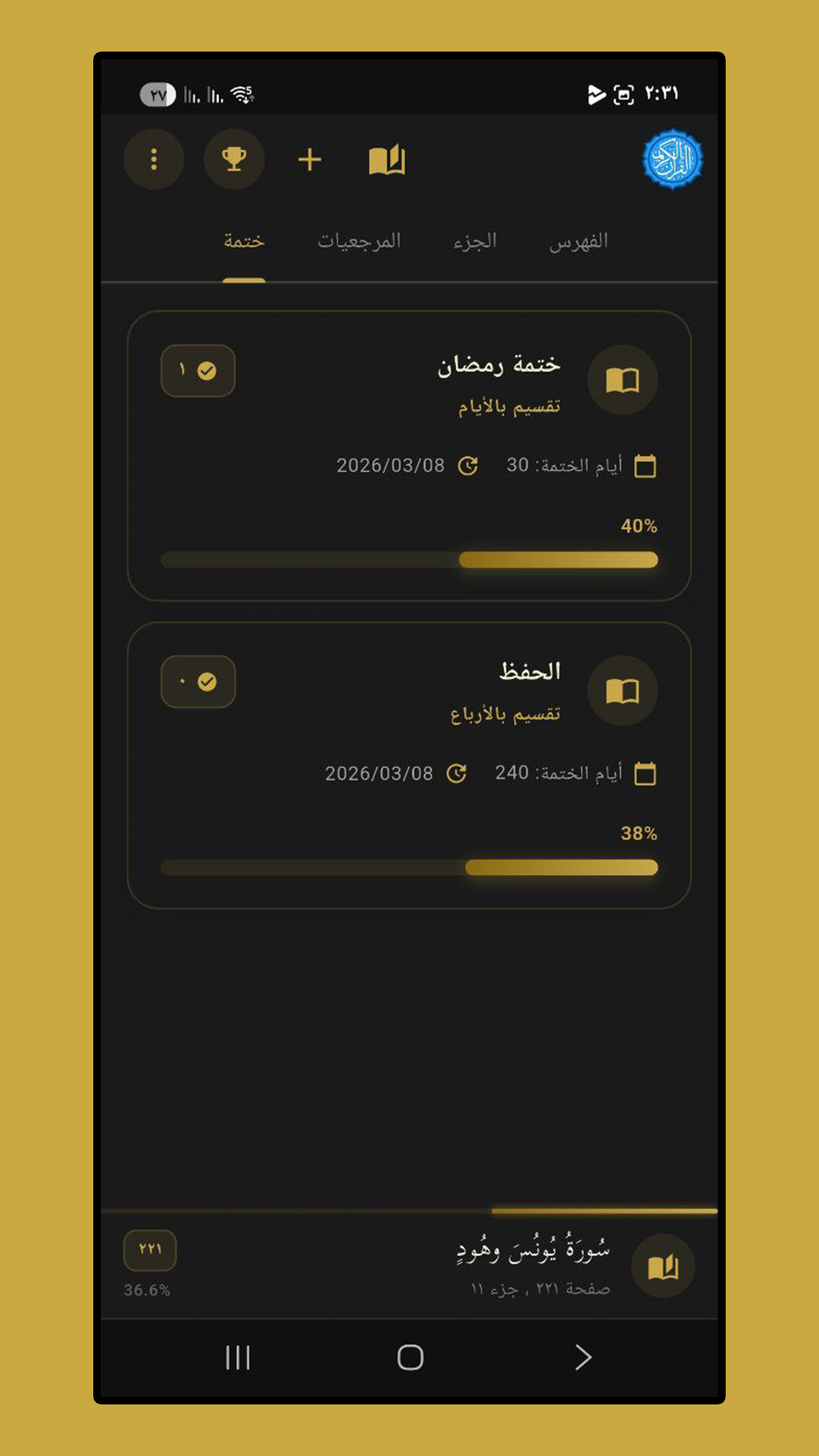 - نظام الختمات المتقدم: أنشئ خطتك الخاصة بناءً على عدد الأيام، الأرباع، أو اتبع "تحزيب الصحابة" الشهير لختم القرآن.