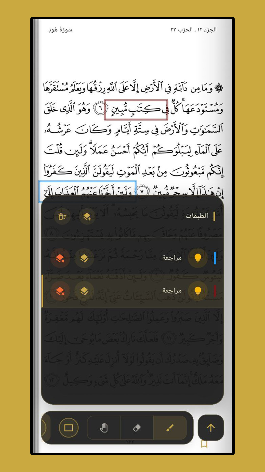 - نظام الطبقات (Layers): لأول مرة في تطبيق قرآن، يمكنك الرسم والكتابة وتدوين ملاحظاتك وتدبراتك مباشرة على صفحات المصحف مع إمكانية التحكم في شفافية ولون الخط.