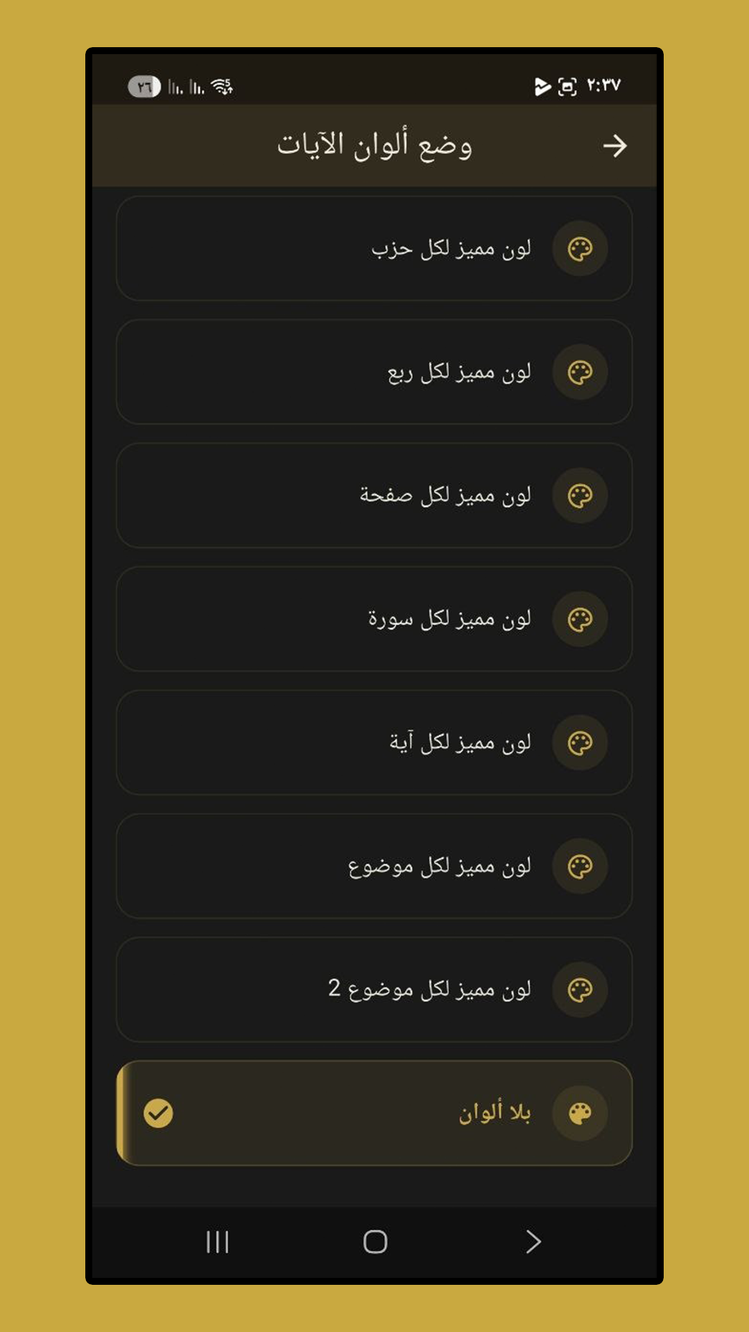 - التلوين الموضوعي: نظام فريد لتلوين الصفحات بناءً على موضوعات الآيات، أو تقسيمات الأجزاء والأحزاب والأرباع.
