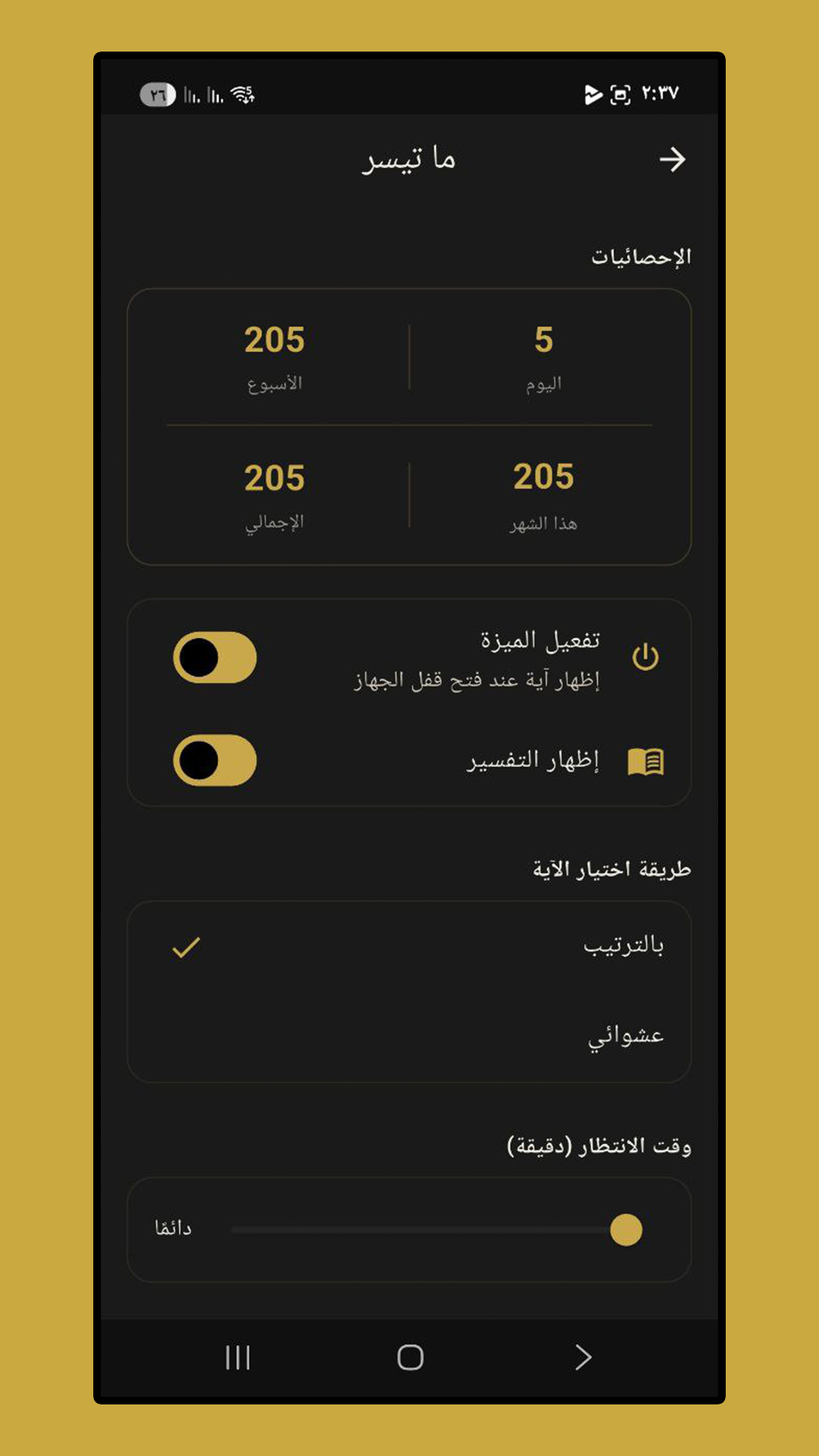 - ما تيسر: ميزة ذكية تظهر لك آية كريمة عند فتح قفل الهاتف لتبقي قلبك معلقاً بالقرآن.