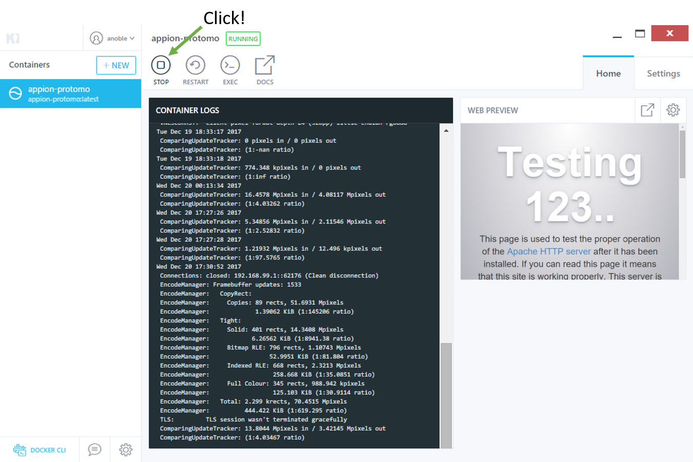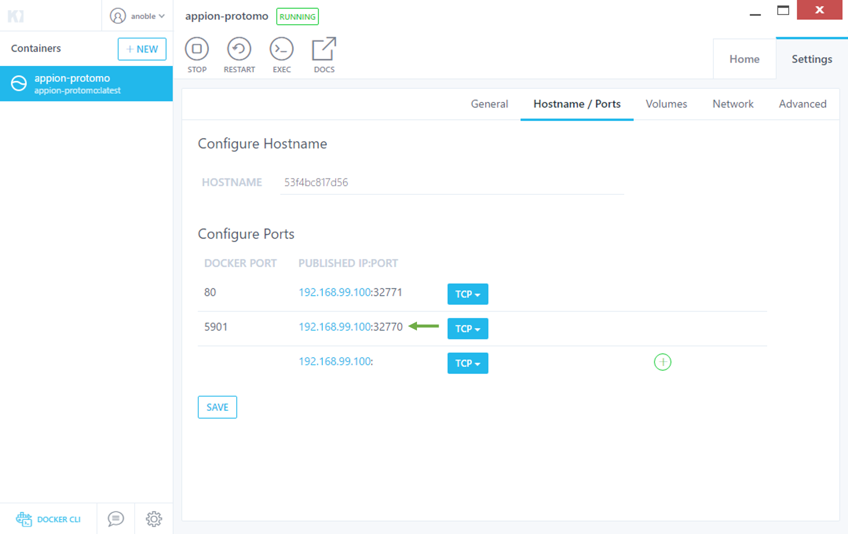 The address and port next to Docker Port 5901 is for vnc access. In the example shown this means
