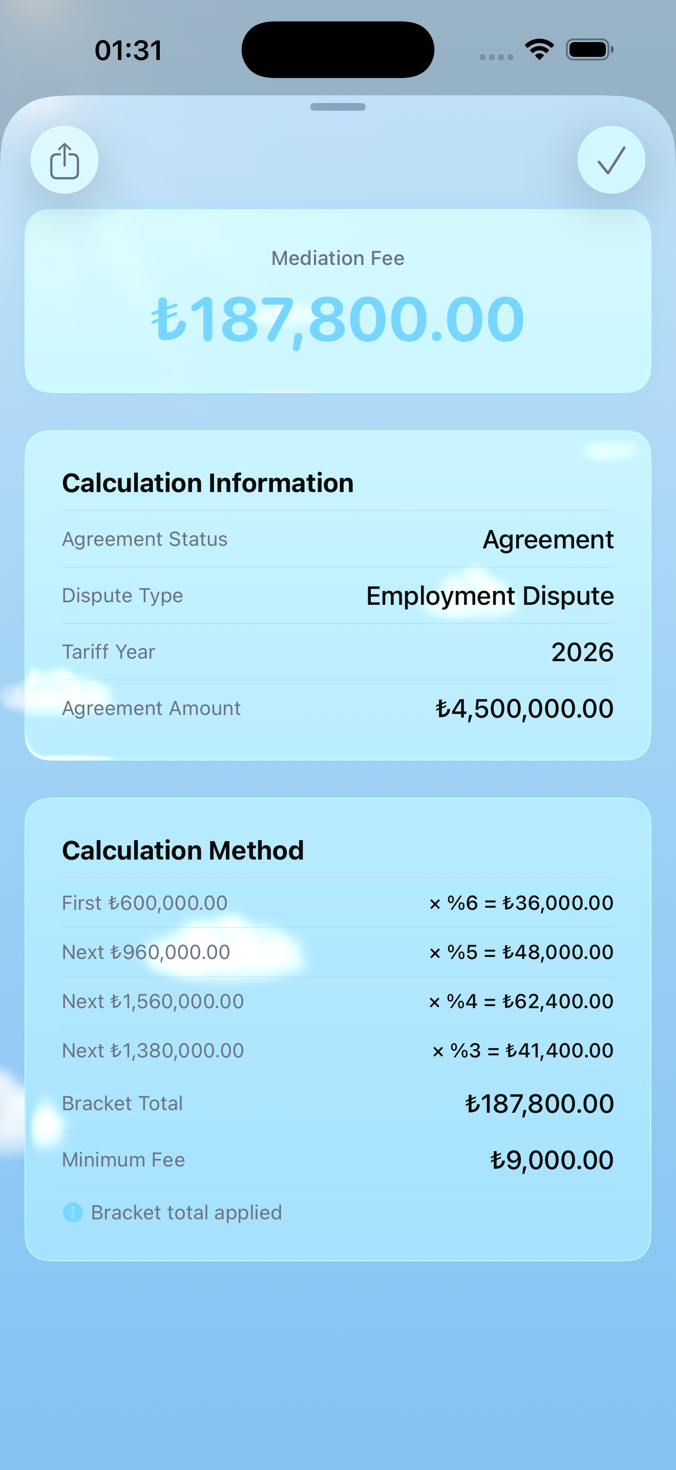 - ๐ค Text Export: Share calculation results with detailed mediation fee breakdown as text file