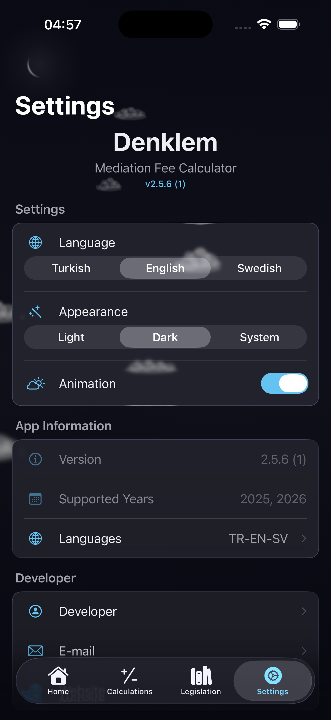 DENKLEM (from Latin "aequare" = "to equalize") is a comprehensive native iOS application for calculating mediation fees according to Turkish law. Written from scratch with SwiftUI, the app performs calculations based on the 2025 and 2026 mediation fee tariffs.