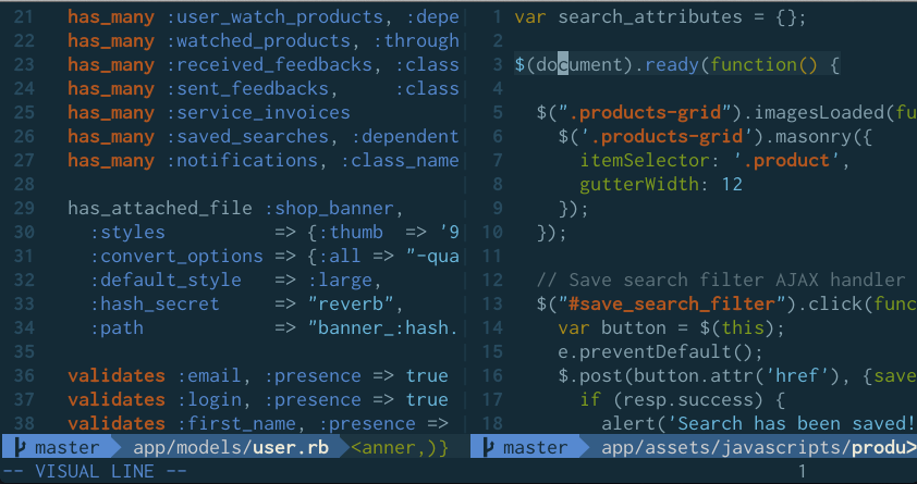 ,vvand,ccto switch between view and controller - these are maps to :Rcontroller and :Rview. Explore the :R family of commands for more fun from rails.vim!,rsand,rlto run rspec or a spec line in iTerm (check iTerm window for results),ssand,slfor the same usingspring rspecwhich makes your Rails specs faster by caching the Rails env (must have spring gem installed)- vim-ruby-refactoring - try