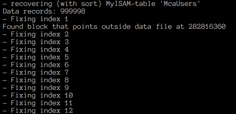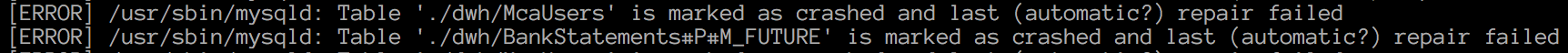 #### Log <img width="862" alt="screen shot 2017-11-13 at 11 10 35 am" src="https://user-images.githubusercontent.com/7008520/32709497-7164a948-c863-11e7-819b-d4db7a7982a0.png"> #### Stop mysql server ``` sudo service mysql stop ``` #### Chang directory ``` cd /var/lib/mysql/YOUR_TABLE_NAME ``` #### Run myisamchk ``` myisamchk -o McaUsers ``` <img width="400" alt="screen shot 2017-11-13 at 11 18 47 am" src="https://user-images.githubusercontent.com/7008520/32709644-863dca7e-c864-11e7-9c12-a85bde85606e.png"> ``` myisamchk -o SaleItemsTable#P#M_XX_FUTURE ``` <img width="517" alt="screen shot 2017-11-13 at 11 19 11 am" src="https://user-images.githubusercontent.com/7008520/32709648-8ea4bef2-c864-11e7-9e0a-7666ec52a032.png"> #### Start mysql server ``` sudo service mysql start ```