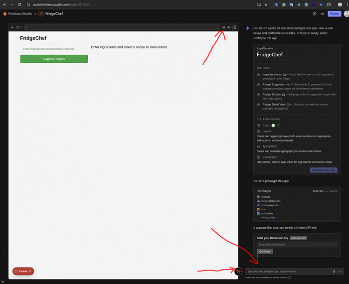 - On the dashboard, locate the “Prototype an app with AI” field. In the input field, enter a natural language description of your app. For example: A simple recipe maker that generates recipes based on the ingredients I have in my fridge. Simple UI, green color scheme.