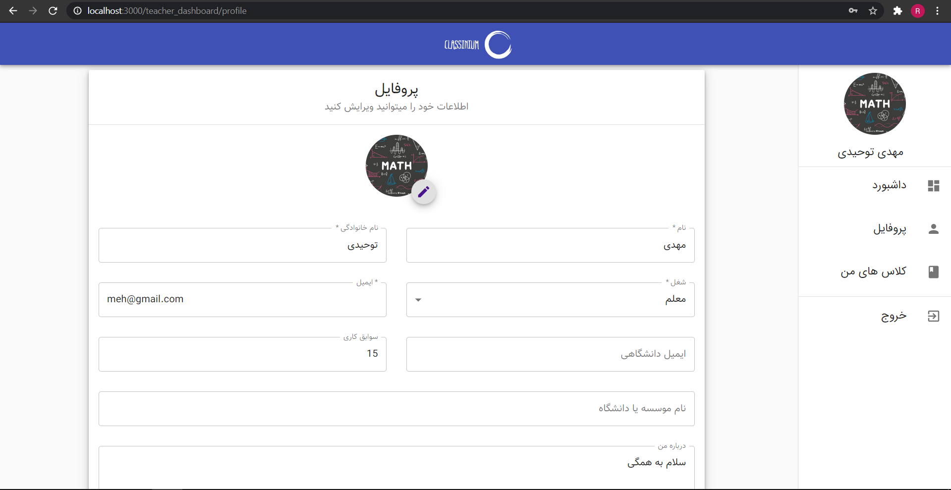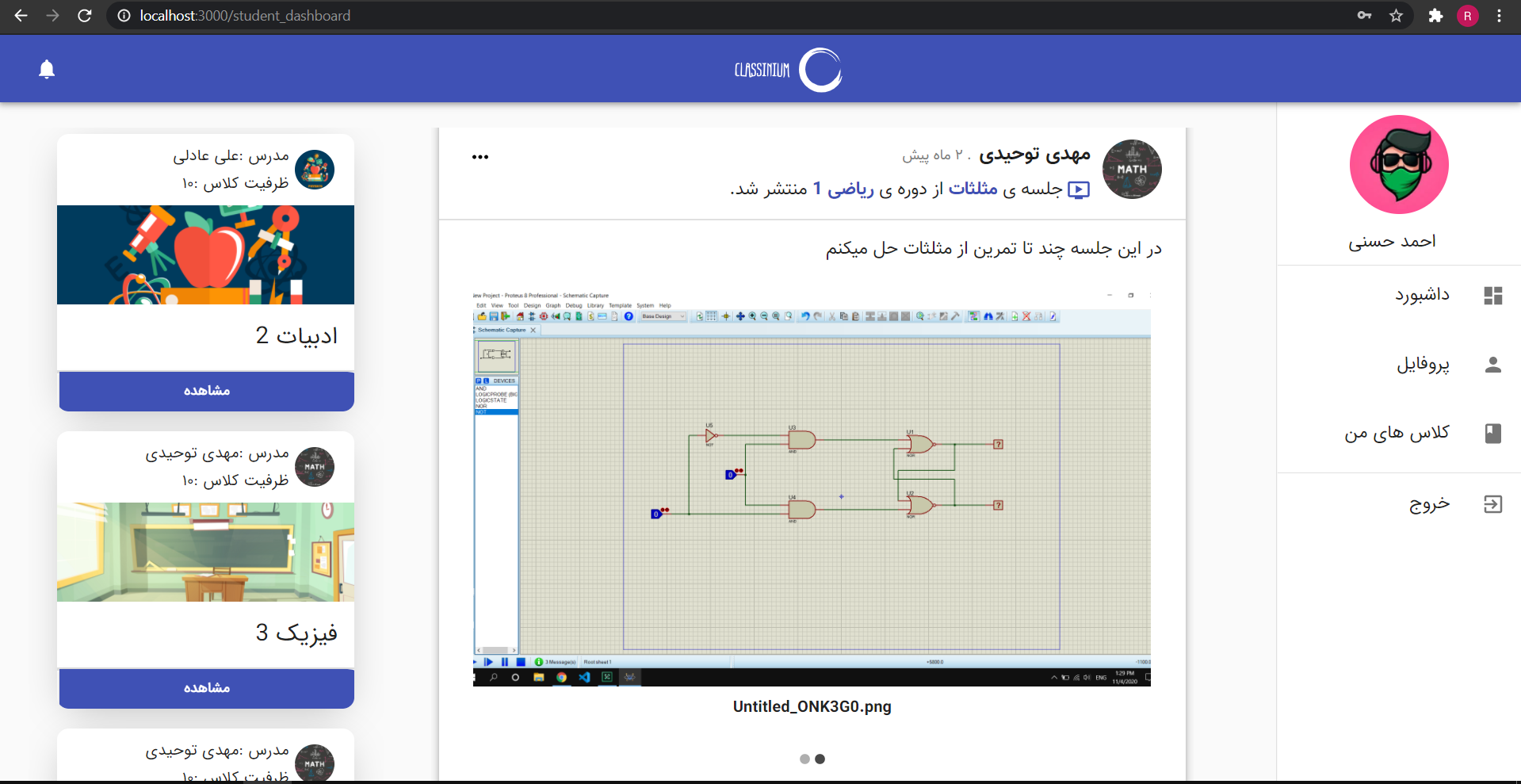Our team felt the need for a good online class management system. So we decided that for our project, we develop a system where you could easily create classes as a Teacher or attend the classes you need as a Student. Front-end of this website is developed with React and the Back-end with Django.
