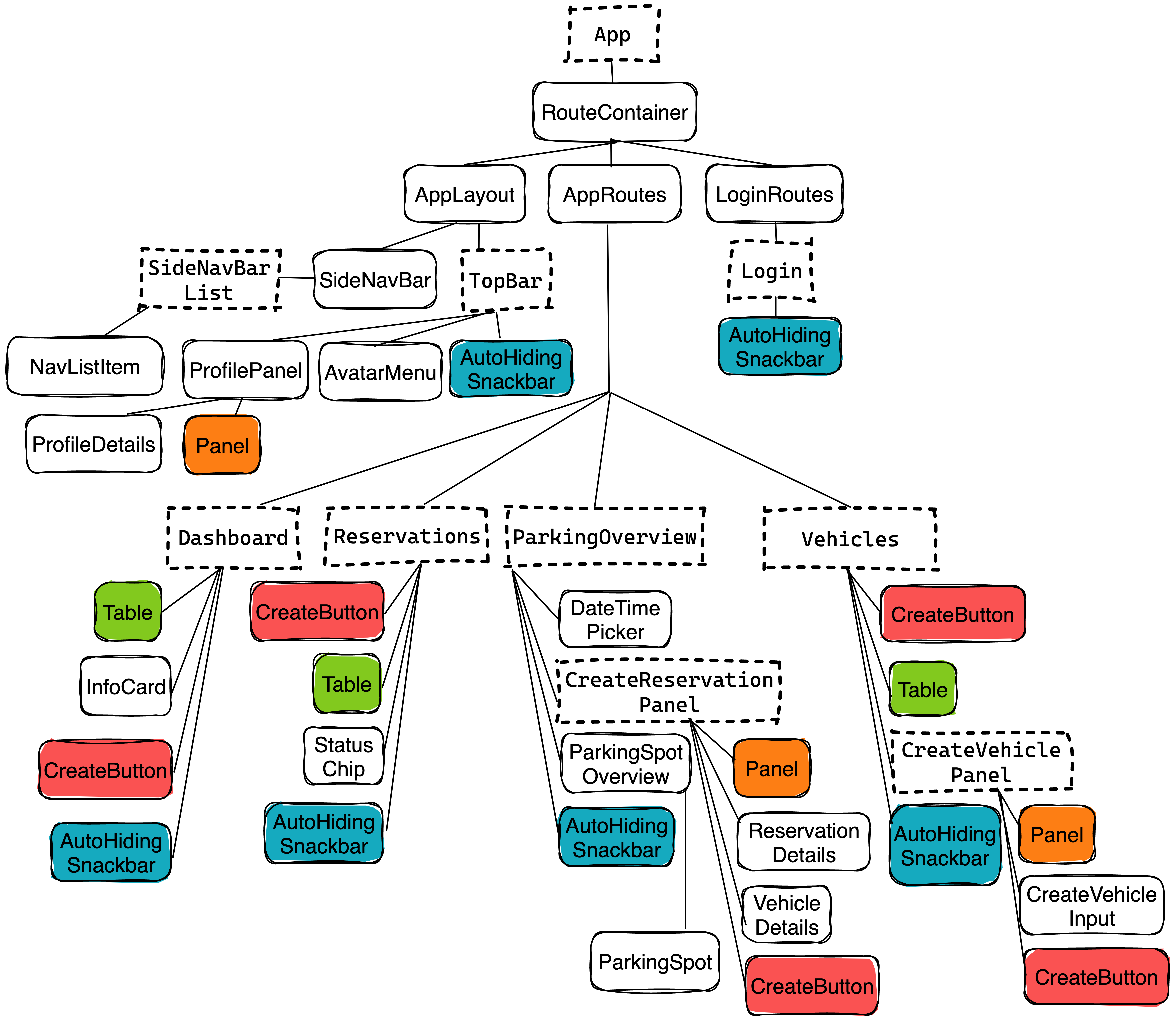 A React user interface for a parking reservation system. The user interface allows users to create, view, and cancel reservations. Users can also save, view, and delete vehicles. The user interface uses a mock server to display generated data and simulate scenarios such as error cases.