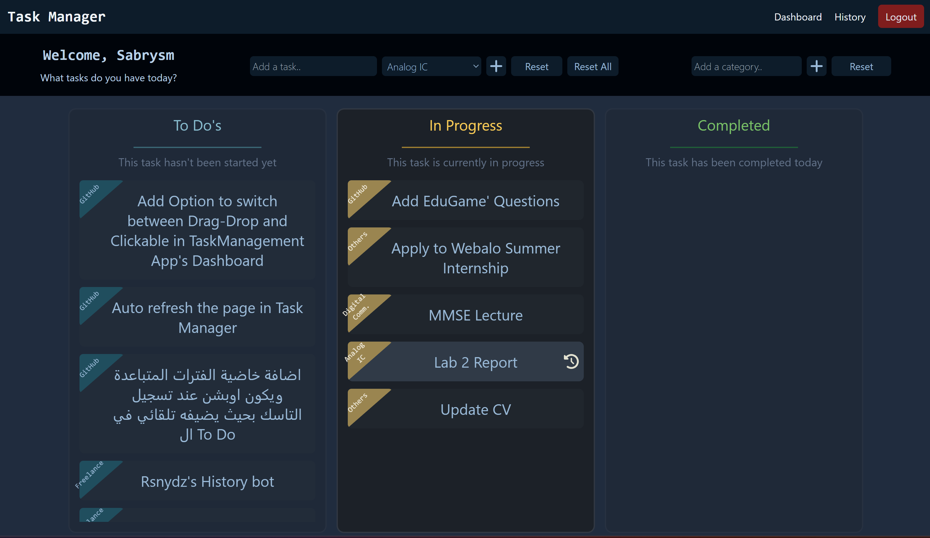- Task Status: Organize tasks into three categories: "To Do," "In Progress," and "Completed."