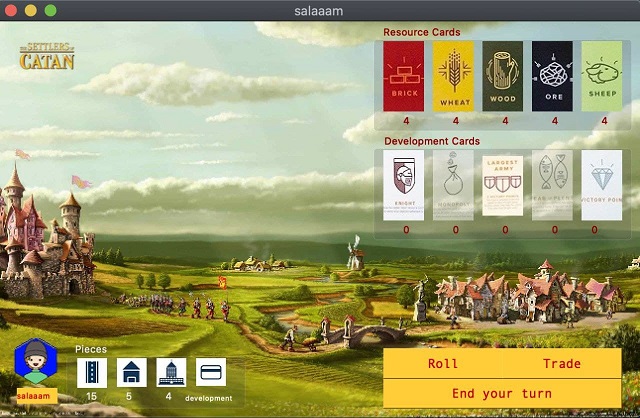 Every player has such window, you can find resource cards, development cards, player username and photo, trade and turn button and buildings here.