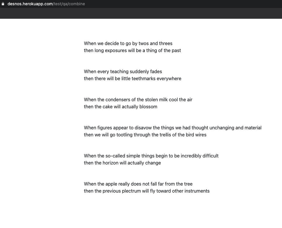 Each user using the "combine" endpoint will see a different version of the poem. Usually there is a set period where people enter text before a separate "combine" point where a chosen person presents the "combine" page.