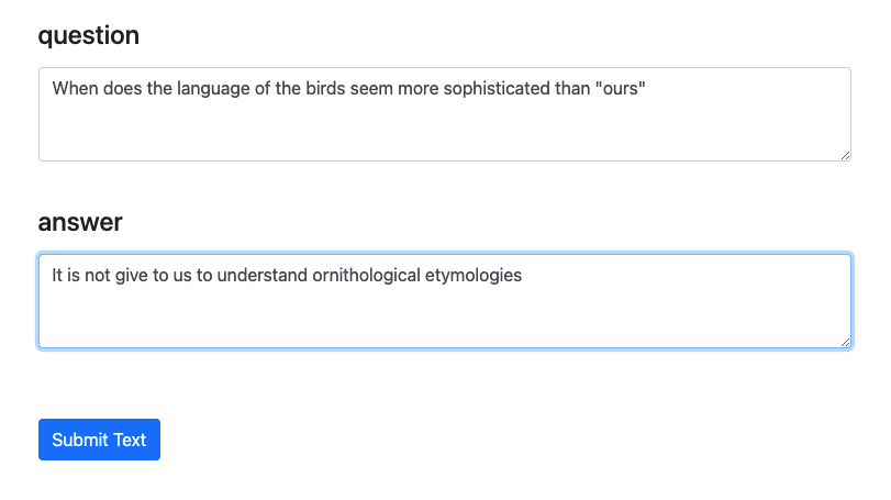The main bit of presentation logic that we worked out that evening was the rate at which combinations would be displayed: too quickly, and the resulting poem soon became overwhelming; too slowly, and the poem seemed to drag, as if someone were speaking too slowly. After many iterations, we settled on a rate of one couplet every three seconds. With the notebook code in hand, I left to develop a web application version on my own, one that would both collect the lines from participants and display them.