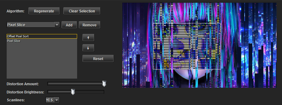 When the regenerate button is clicked, and for any subsequent pixel sorting actions, only that region of the image will be pixel sorted, for only that algorithm. Each algorithm that is added to the list can have its own selection region to pixel sort. Example: Offset Pixel Sort and Data-as-Sound algorithms are in the list. Offset Pixel Sort can have the upper right hand corner of the image pixel sorted, and Data-as-Sound can have the lower left hand corner of the image pixel sorted.