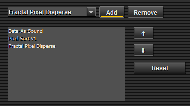 Glitch Kernel provides the ability to combine or stack multiple algorithms together to create a unique result. Algorithms are interpreted in the order they are displayed in the list. The order of algorithms can be changed with the arrow keys on the right side of the algorithm list display. The list of glitching algorithms is interpreted from the top-down. The result of an algorithm above another one is piped into the input of the algorithm below it. In this way, you can combine multiple algorithms together. Example: Offset Pixel Sort + Vertical Pixel Sort will yield different results than Vertical Pixel Sort + Offset Pixel Sort