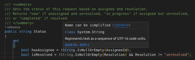 bool hasAssignee = !string.IsNullOrEmpty(AssigneeId); bool isResolved = !string.IsNullOrEmpty(Resolution) && Resolution != "unresolved";I am surprised your dev environment didn't give you the "IDE0049 Name can be simplified" warning?
