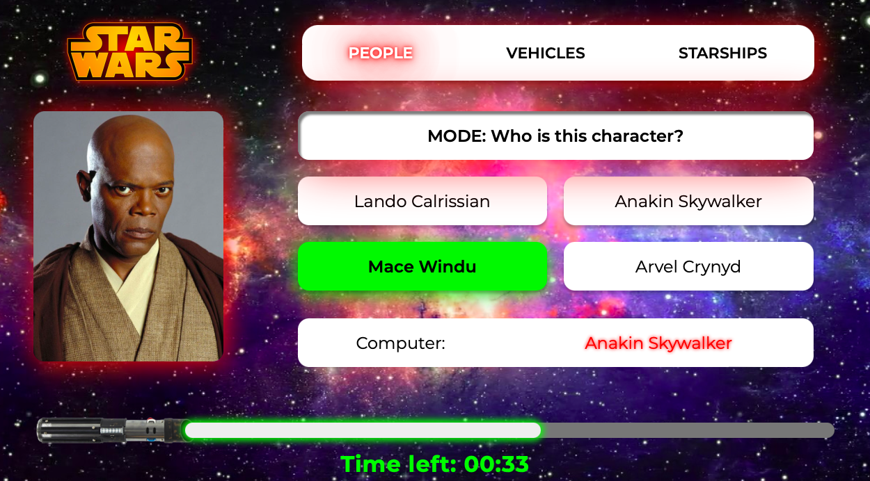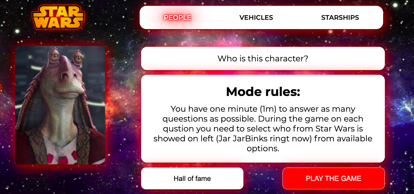 - At the beginning, the user can choose one of the three game modes (People, Vehicles or Spaceships) and read rules.