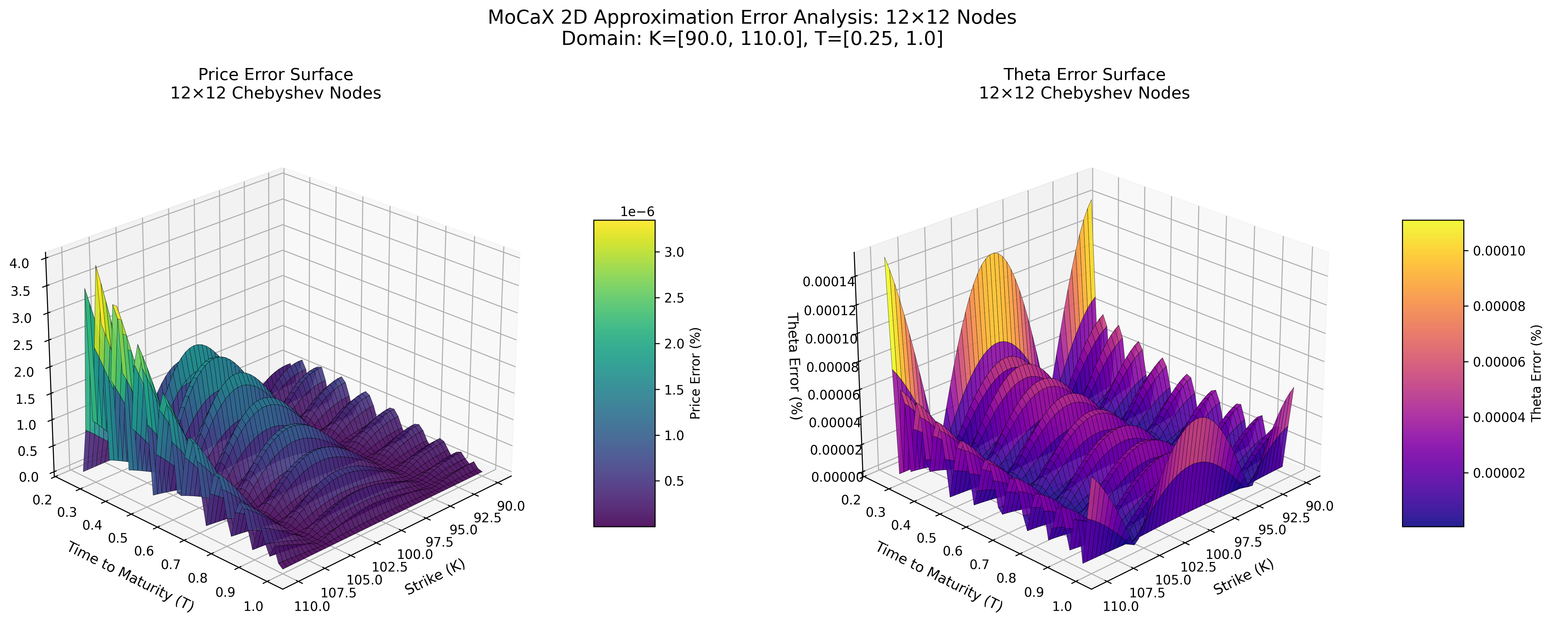 | Chebyshev TT | 0.014% | 0.029% | ~0.35s | ~0.004ms | TT-Cross, ~7,400 evals (vs 161k full) |