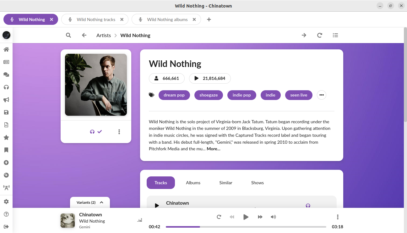 muffon is a cross-platform music streaming client for desktop, which helps you listen to, discover and organize music in an advanced way.