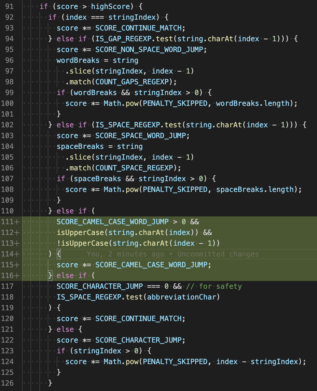 }elseif(SCORE_CAMEL_CASE_WORD_JUMP>0&&isUpperCase(string.charAt(index))&&!isUpperCase(string.charAt(index-1))){score*=SCORE_CAMEL_CASE_WORD_JUMP;}elseif(functionisUpperCase(char){// checks if the character is an uppercase (unicode safe)returnchar.toLocaleUpperCase()===char;}