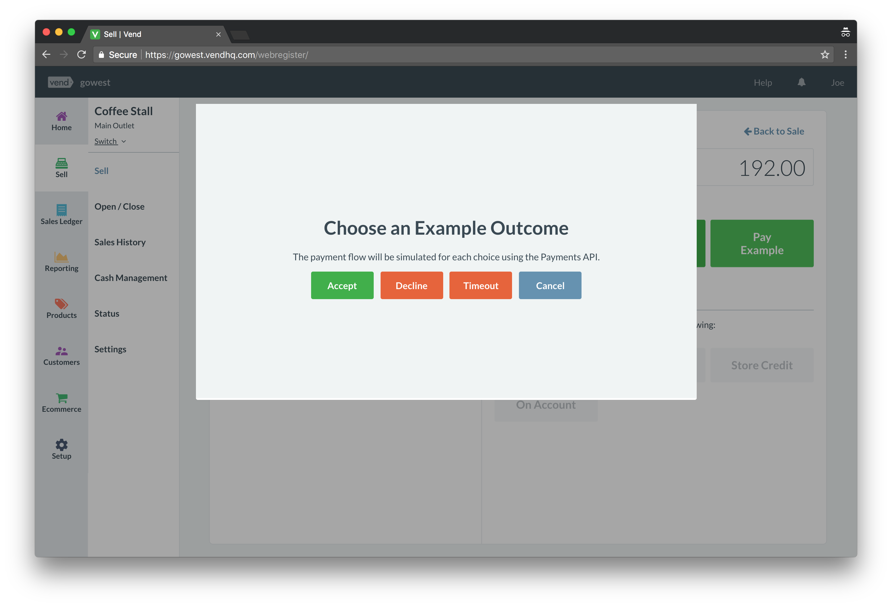 - Go to the Sell Screen on Web or iOS, add a product, click Pay, and choose "Payment Example". This will launch a modal contaning the Pay Example app, allowing you to simulate the payment API flows.