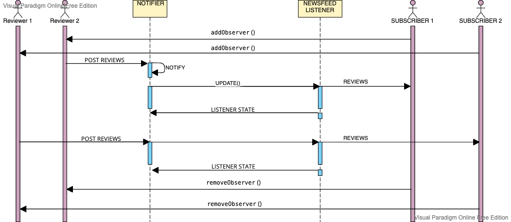 This describes the ongoing picture inside the application from programmer’s perspective. In the below given diagram, two reviewers has been defined along with two subscribers. The subscribers are allowed to subscribe to the reviewers they wish to add. The NewsFeedListener are used to communicate with the corresponding reviewer. Once the Subscriber has subscribed to them, whenever the Corresponding reviewer has posted any content, the subscriber will receive a notification regarding it and can view the data.