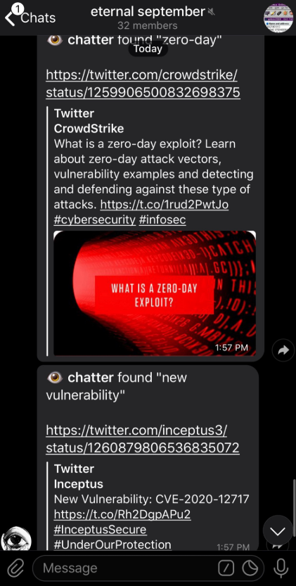 the benefit of reporting discoveries to telegram groups is that telegram crawls the urls chatter presents it with and displays relevant text and image previews associated with the content.