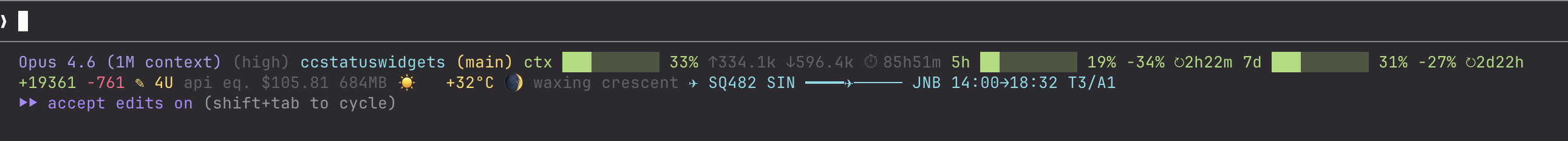 ccw add,ccw remove,ccw listto manage widgets without editing JSON - 📐 Multi-line Layout — arrange widgets across multiple status lines, any order