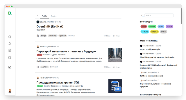 A note is a summary of some material, for example: a book, video, course, article, etc. A source is a some information material. The user can search for public notes or notes by the name of the Source. The user can create public notes and drafts, subscribe to other users.