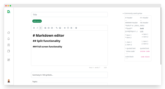 Content Management Users can create and edit content using a user-friendly interface (WYSIWYG Markdown Editor), and content can be tagged for easier categorization and searching. Users can also bookmark posts to easily access them later and like posts to show their appreciation. Posts can be downloaded in Markdown, PDF, or HTML format.