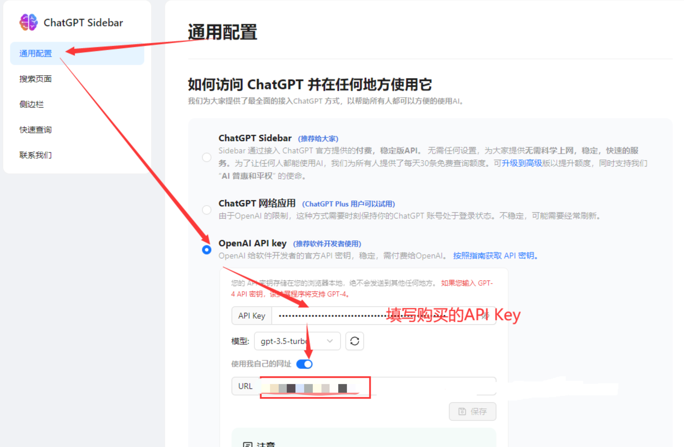 安装好插件后进入设置页面,如图所示修改设置,将url修改为 https://api.whatai.cc 。