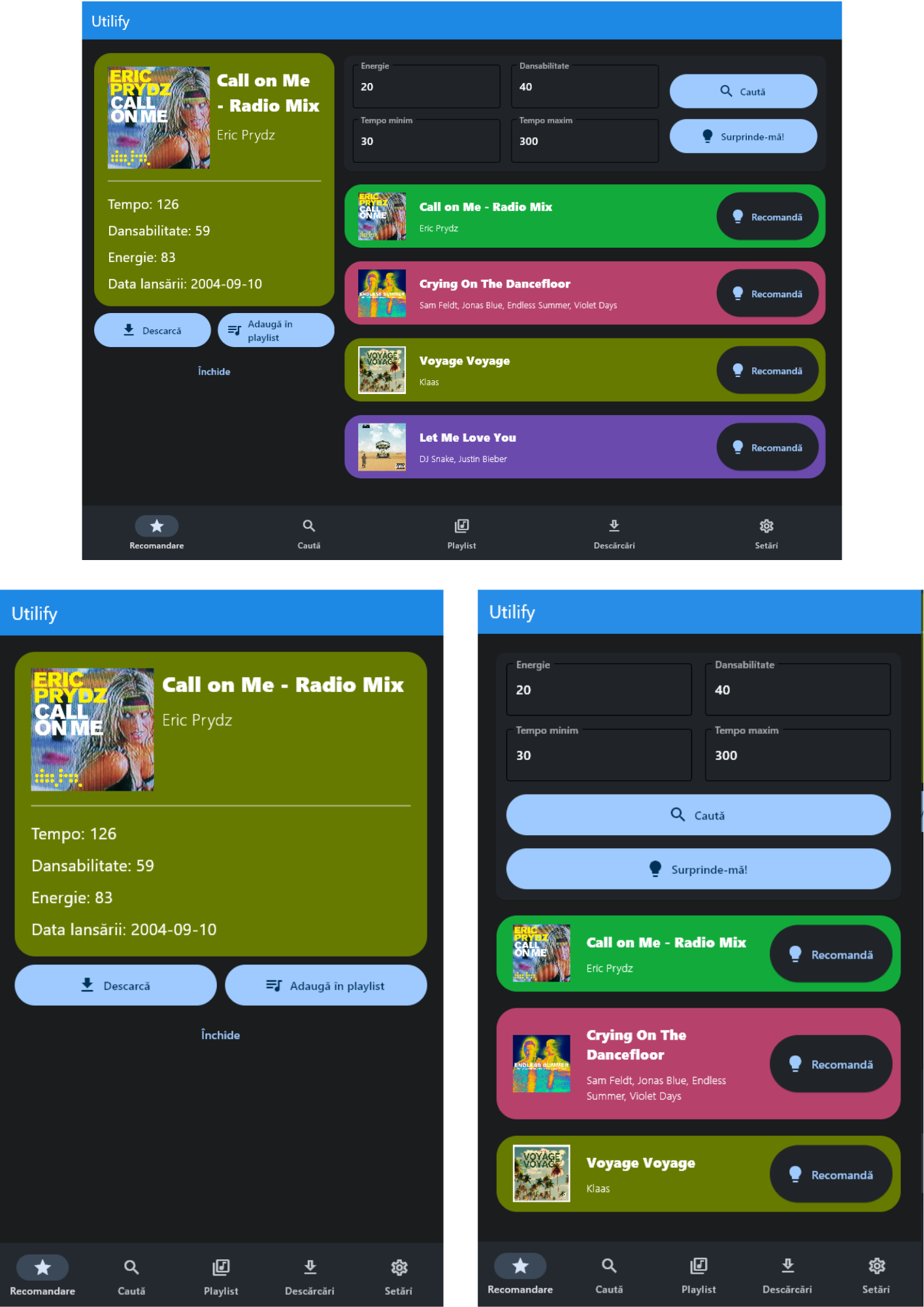 Utilizatorul beneficiază de filtrare bazată pe energie, dansabilitate și tempo, căutare pe bază de nume sau artist, cât și de recomandarea de melodii bazată pe similaritate cu un sistem inteligent.