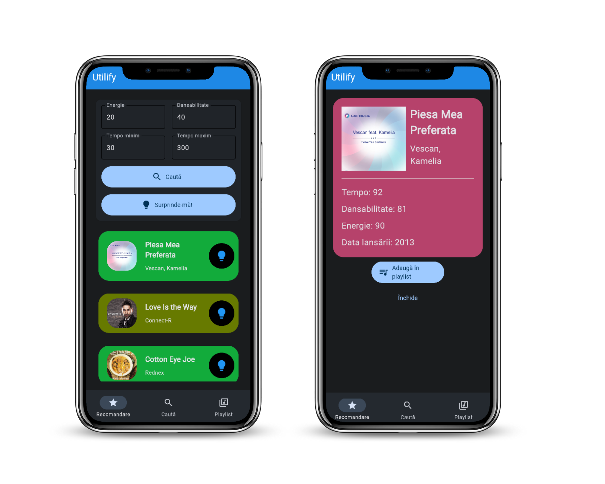 Aplicația permite filtrarea melodiilor după caracteristici specifice, precum: energie, dansabilitate și tempo