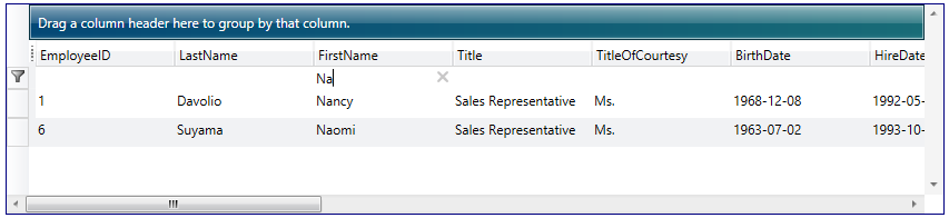 The SearchControl provides powerful search capability, providing end-users with an easy to use UI for finding items in the datagrid's cells. Users can search forwards or backwards, and use keyboard shortcuts. Works with Master/Detail views, collapsed groups, and also with data virtualization enabled.