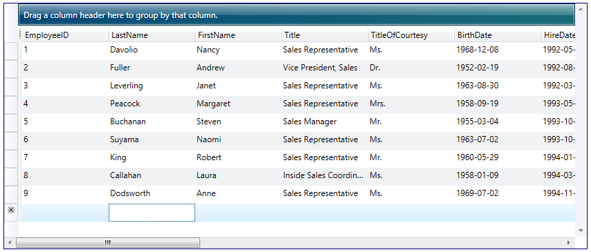 Xceed DataGrid for WPF provides design-time support for Visual Studio and Expression Blend. In Visual Studio, the DataGridControl control will appear in the toolbox under the Xceed tab and can be added to the design surface by double-clicking on the control or through drag and drop. It's properties can then be modified through the Visual Studio property grid or by using the Xceed DataGrid for WPF Configuration Window.