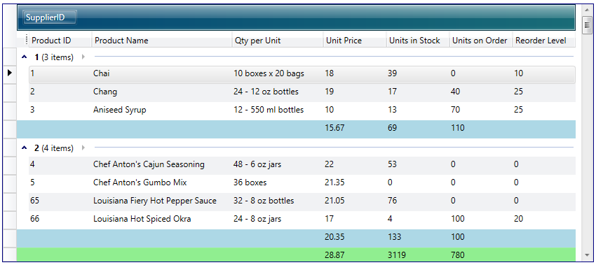 The settings of a grid and its elements can be persisted and re-applied using the SaveUserSettings and LoadUserSettings methods, respectively. By default, column widths, visibility, positions, and fixed-column counts as well as grouping and sorting criteria are persisted; merged columns, their positions, and their visibility can also be persisted. However, these settings can be modified when calling the SaveUserSettings and LoadUserSettings methods.