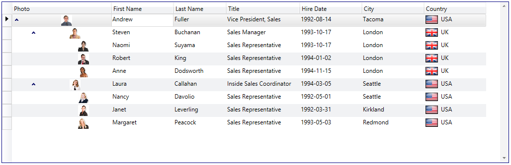 Represents a table-view layout similar to TableflowView, in which rows are laid out horizontally as in traditional grid-like styles, but detail columns are aligned with the columns of the master, and one column displays data using a tree-structure.